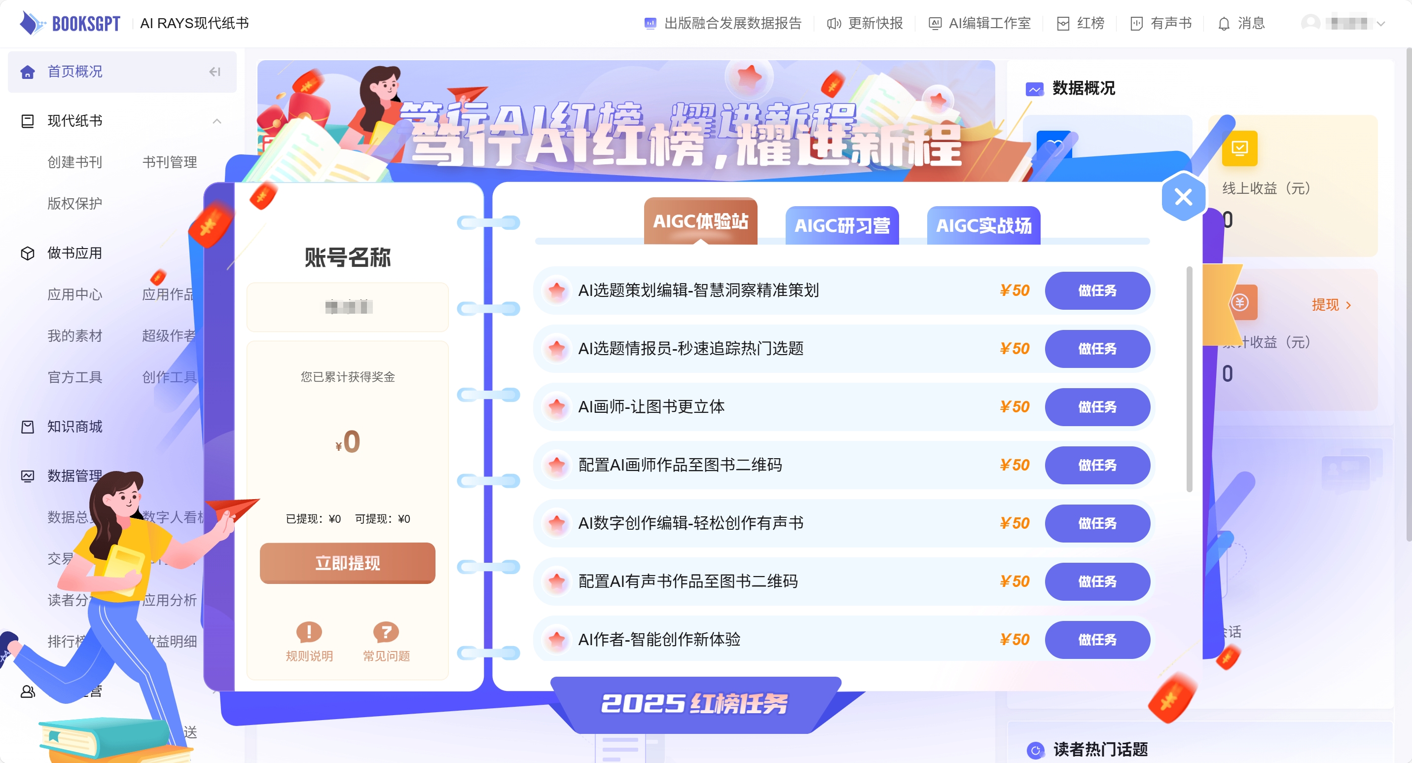 红榜任务是由数传集团联合打造的编辑线上培训体系,核心机制是将自主研发的出版领域专属AIGC工具,拆解为可实操的“技能关卡”,编辑每完成一个任务,就能掌握一项新技能,还能获得真实的奖金。
