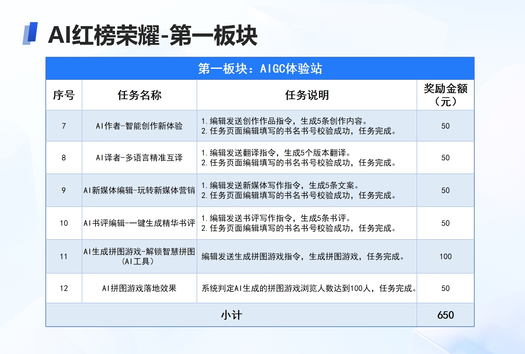 ①AIGC体验站:包括如生成选题解读、多语言精准互译、制作拼图游戏等12项任务。