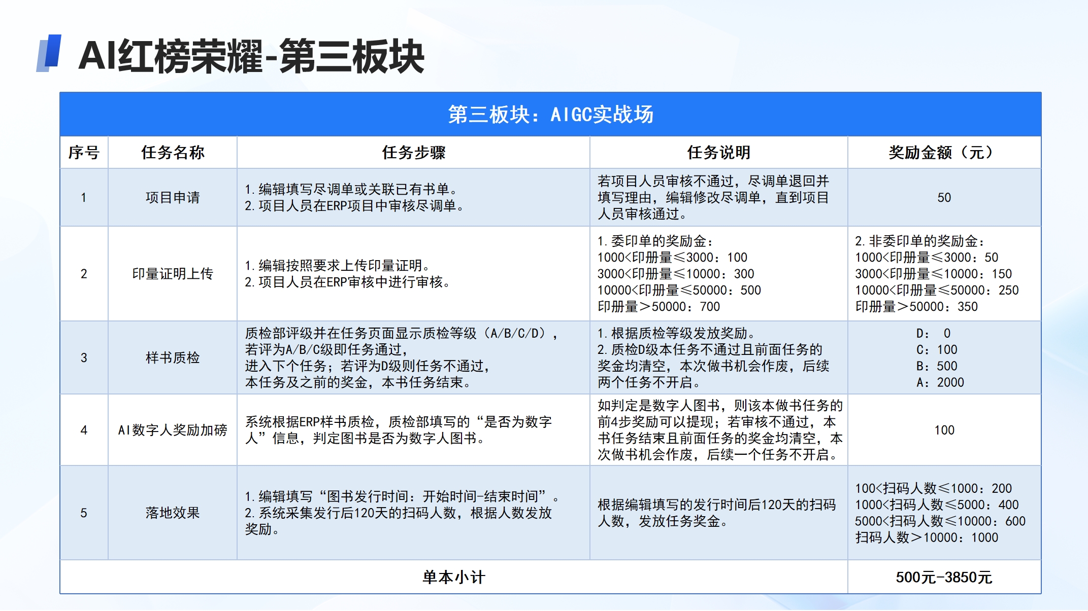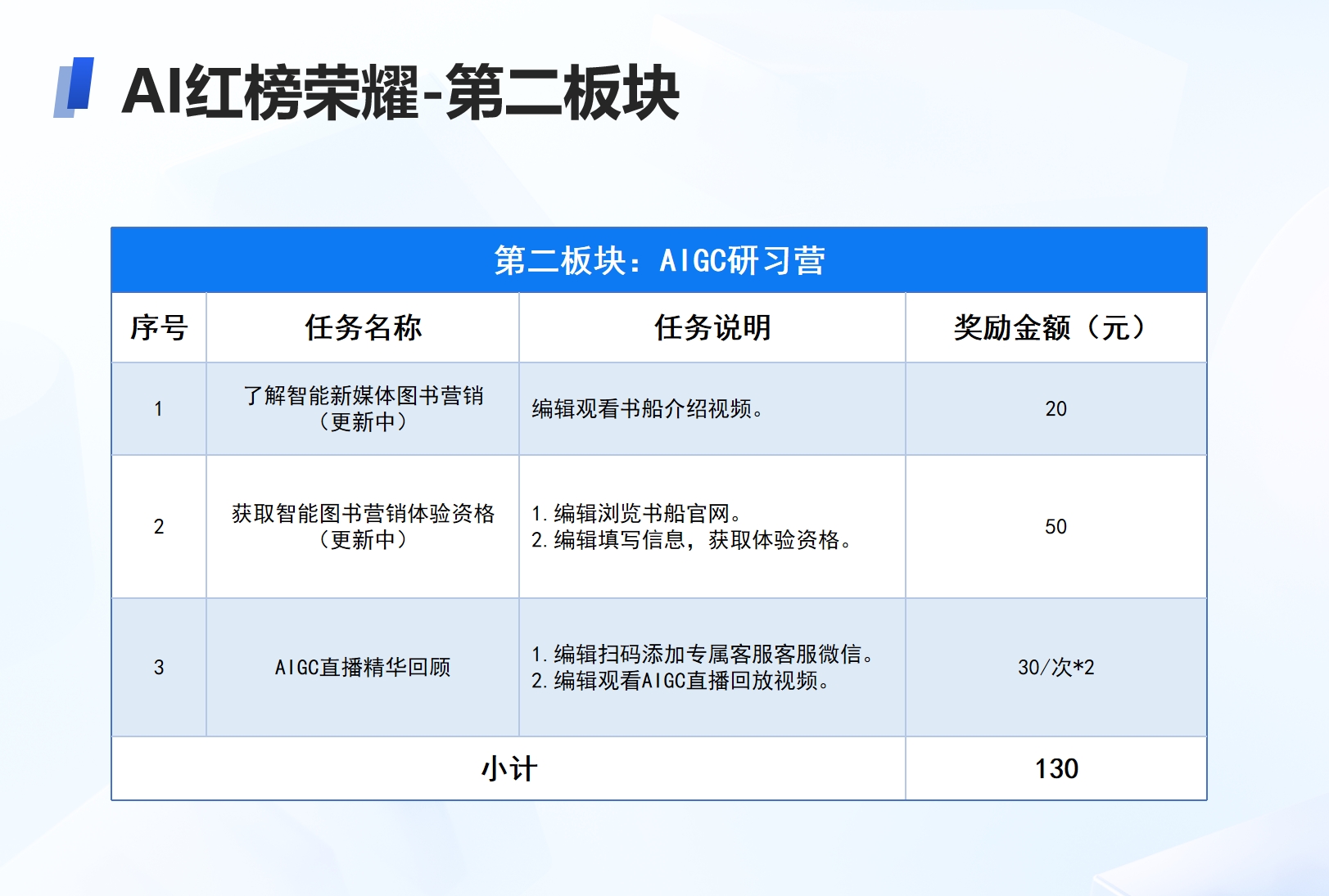 ②AIGC研习营:通过视频课程、直播实训、官网资源学习智能营销方法论,完成学习即可获取功能体验资格;计划于6月完成再次更新,预计新增3个任务,如体验AI图书训练平台、关注出版行业AIGC前沿消息。