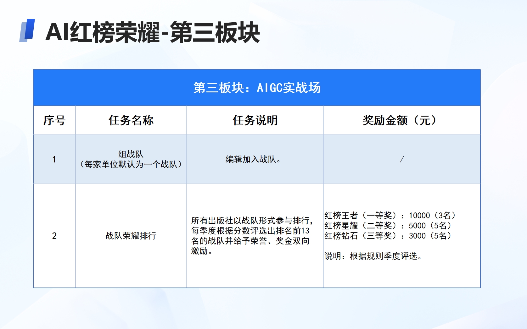 一是团队PK竞技,以出版社为单位组队参与,根据立项数量和参与人数计分,每季度排名前13名的战队将获得荣誉认证和奖金激励。