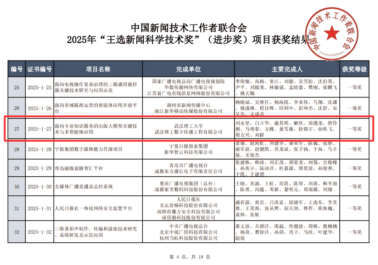 近日,2025年“王选新闻科学技术奖”(进步奖)获奖名单正式公布。数传集团凭借“面向专业知识服务的出版大模型关键技术与多智能体应用”项目荣膺一等奖。