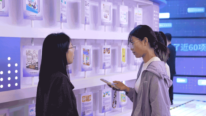 展区现场有一整面的互动墙,上面展示着数传集团最新的AIGC图书数字融合作品。参展观众不禁举起手机扫码体验,近距离感受AI RAYS为纸书带来的数智化力量。